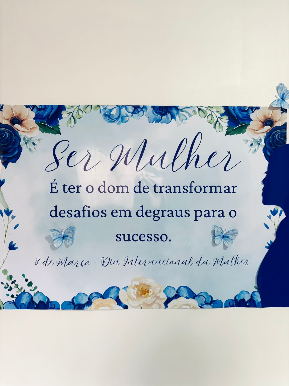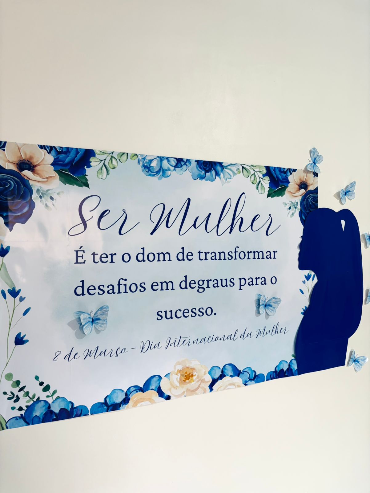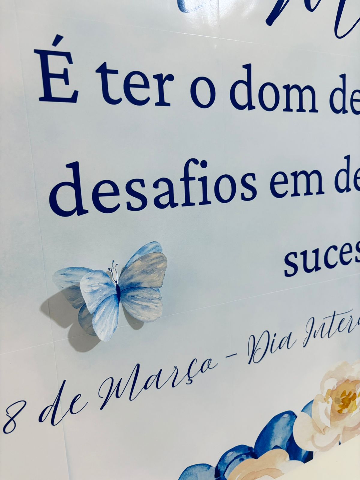 Com uma estética suave em tons de azul e detalhes de borboletas, ele transmite uma mensagem poderosa de superação e crescimento, sendo ideal para escolas, empresas, clínicas e espaços que desejam marcar o dia 8 de março com sofisticação.