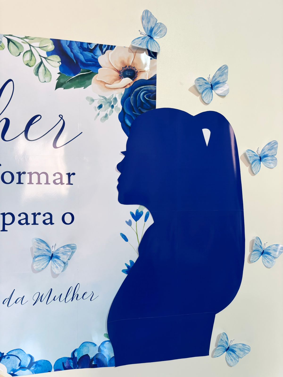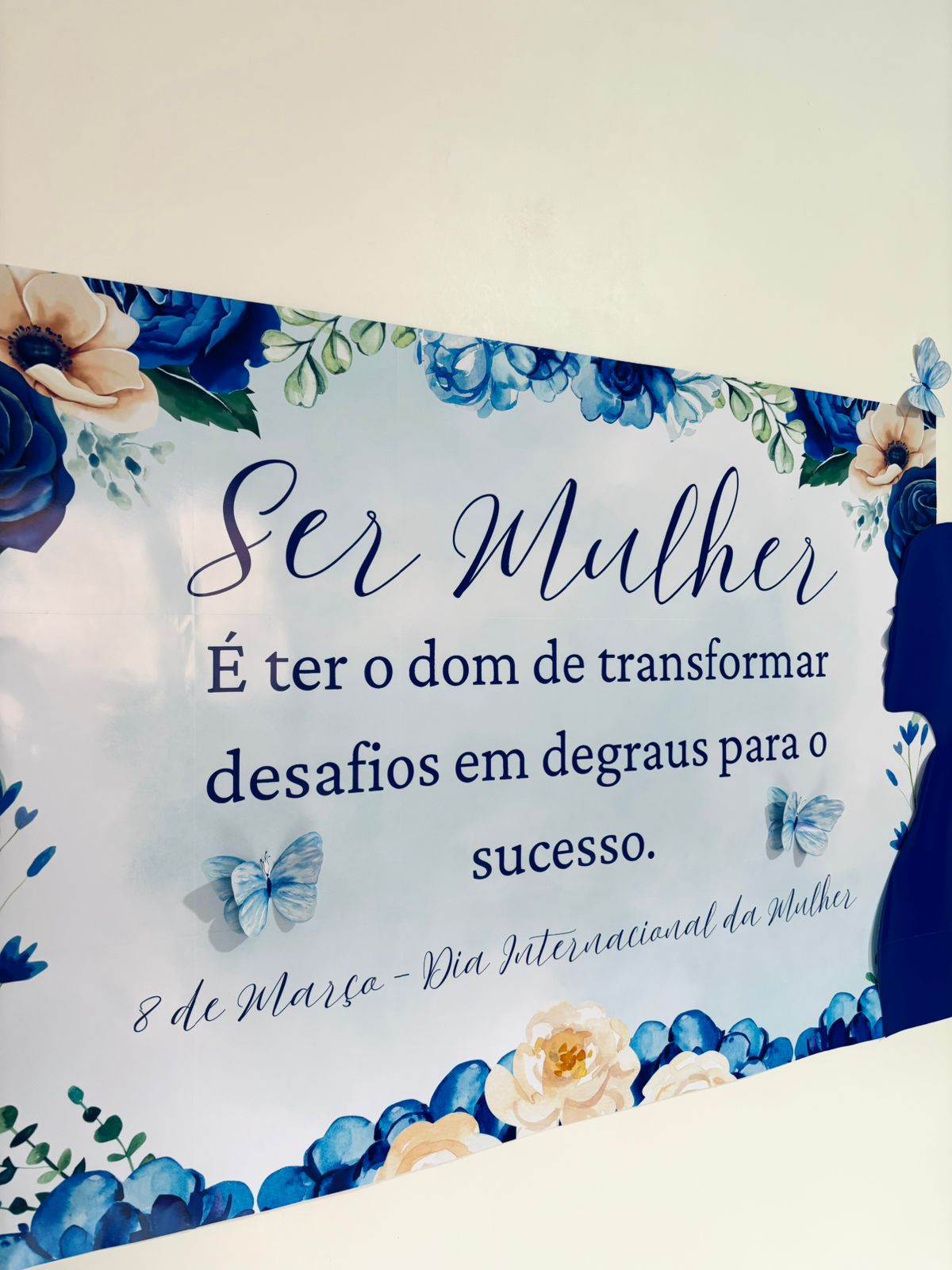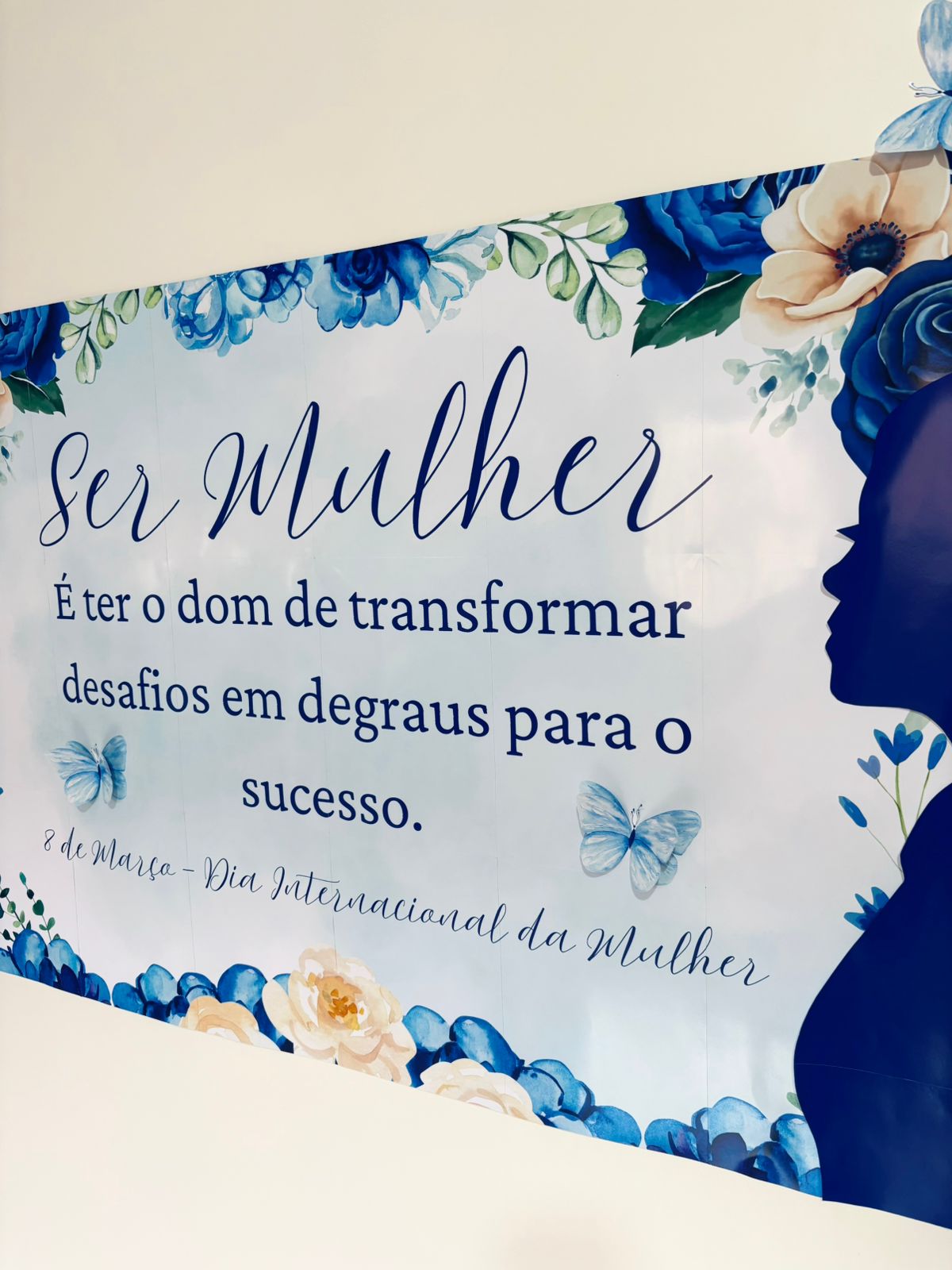 Com uma estética suave em tons de azul e detalhes de borboletas, ele transmite uma mensagem poderosa de superação e crescimento, sendo ideal para escolas, empresas, clínicas e espaços que desejam marcar o dia 8 de março com sofisticação.