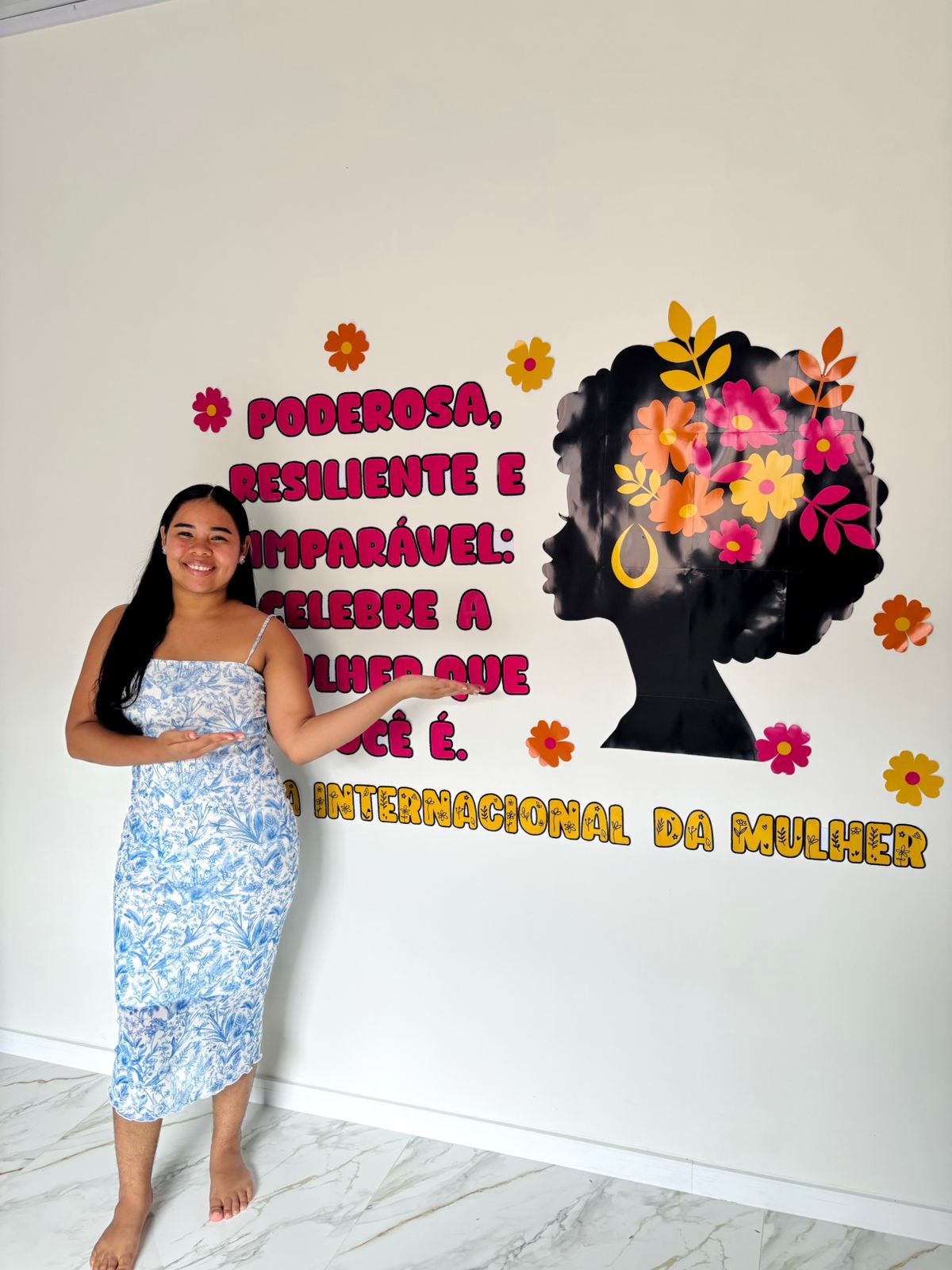 📚 O painel traz a frase marcante: “Poderosa, resiliente e imparável: celebre a mulher que você é”, reforçando o valor e a beleza de cada jornada feminina.